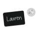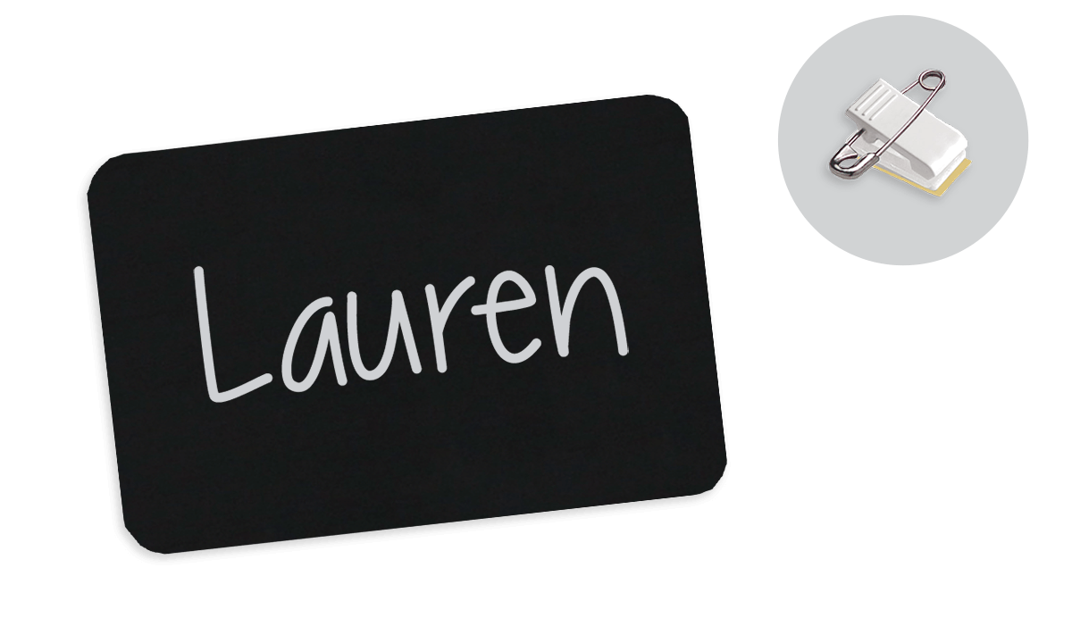 The badge is covered in a chalkboard surface that can be hand-written on with liquid chalk pens to give a blackboard effect, resulting in a friendly and professional look. The chalkboard surface is available in a choice of 7 different colours!